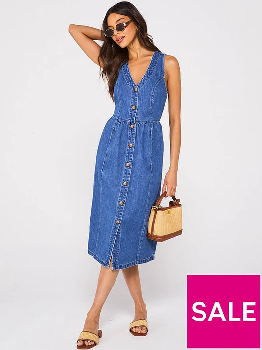 V by Very Sleeveless V Neck Denim Midi Dress - Dark Wash