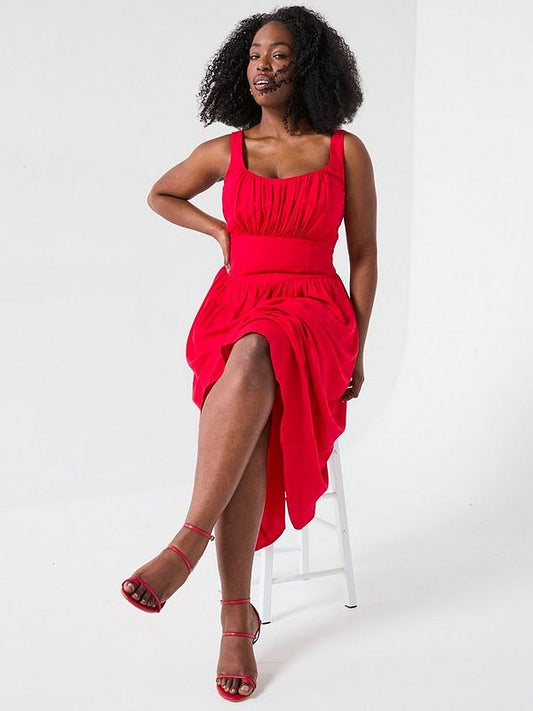 V by Very Curve Shirred Back Waisted Midaxi Dress in red.