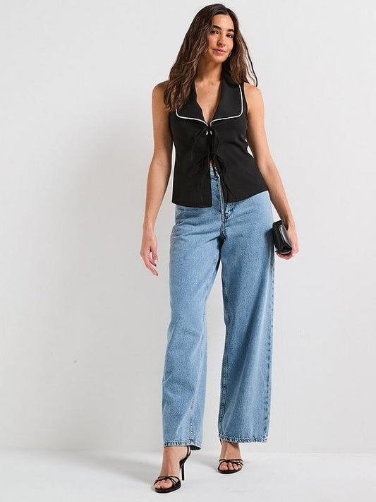 V by Very Contrast Piping Tie Up Top - Black
