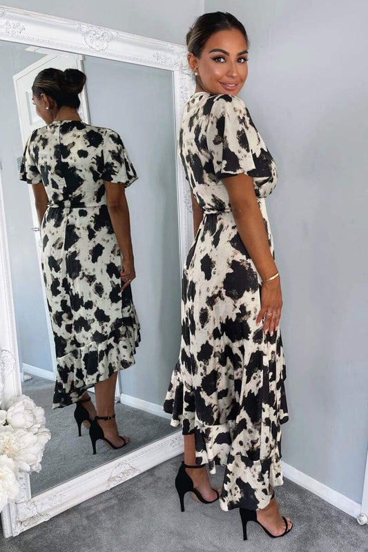 Black And Stone Abstract Print Wrap Midi Dress