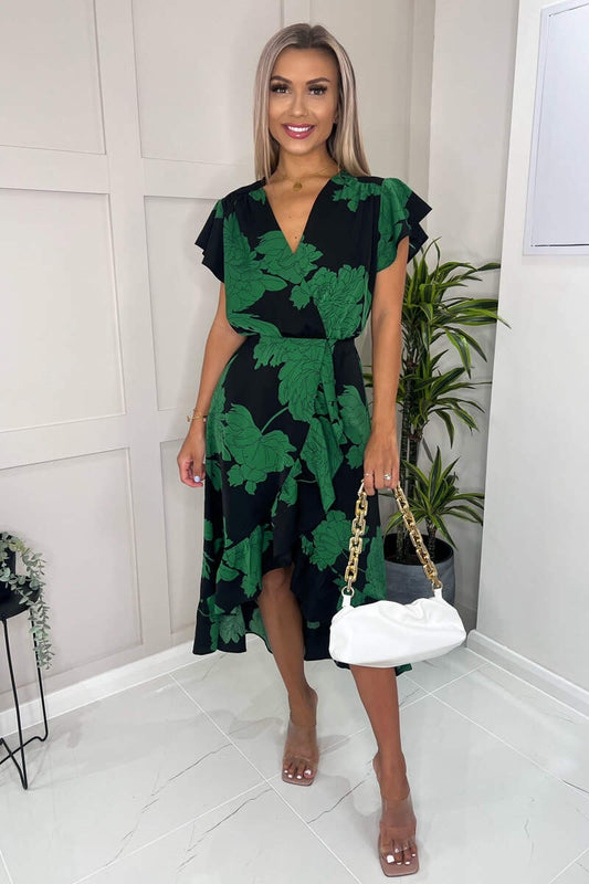 Black And Green Floral Print Wrap Midi Dress
