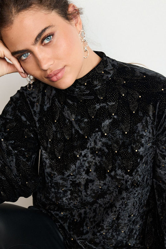 Black And Gold Embellished Longsleeve Velvet Top
