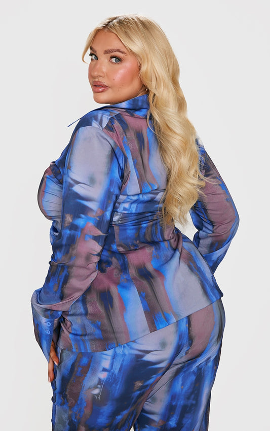 Plus Blue Abstract Print Chiffon Ruched Fitted Shirt and Trouser Set