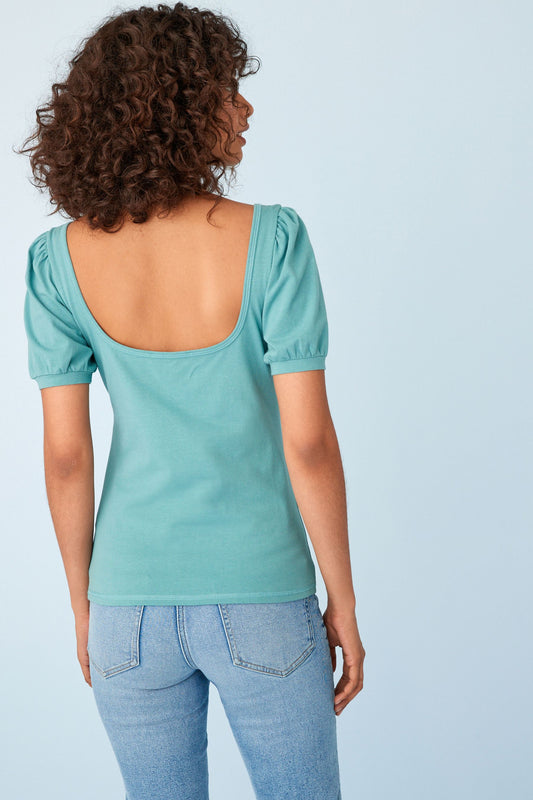 Teal Blue Sweetheart Neck Puff Short Sleeve T-Shirt