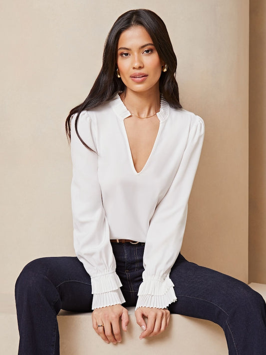 White Frill Ruffle V Neck Long Sleeve Blouse