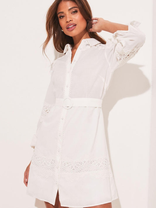 White Long Sleeve Lace Insert Belted Shirt Dress