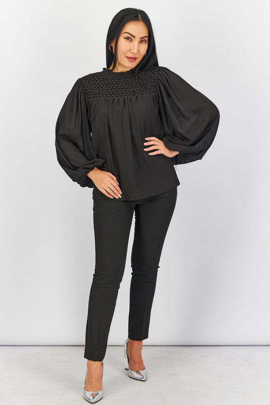Women Ruffle Neck Long Sleeve Studded Blouse, Black and Gold