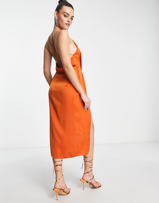 Drape Detail Satin Midi Dress Rust