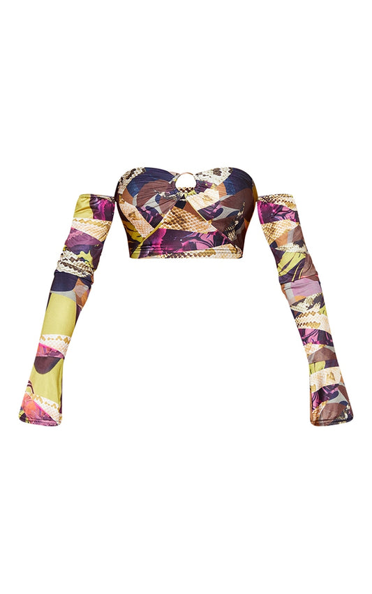 Green Abstract Print Slinky Ring Detail Bardot Long Sleeve Top