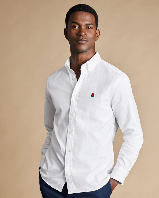 England Rugby Washed Oxford Classic Fit Shirt with Red Rose - White