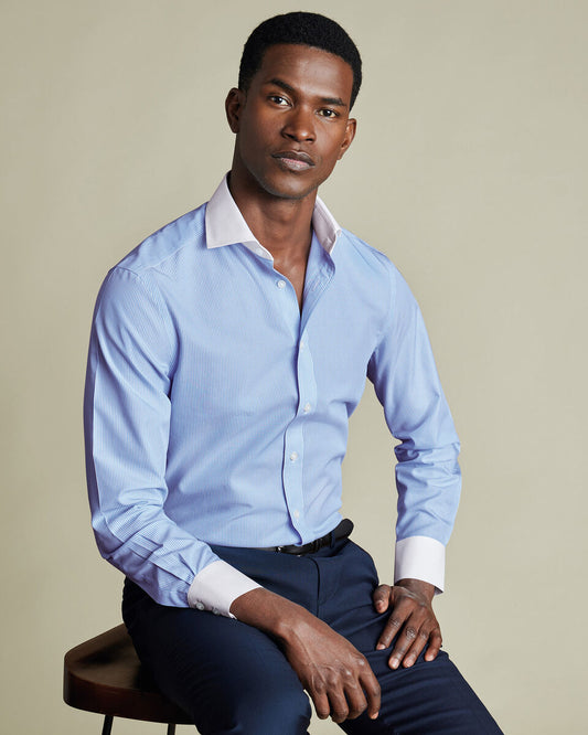 Vendor:Charles TyrwhittRegular price ₦59,800.00 NGNRegular priceUnit price / perSale price ₦59,800.00 NGNCutaway Collar Non-Iron Poplin Stripe Winchester Shirt - Sky