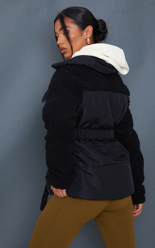 Black Nylon Contrast Borg Cinched Waist Puffer Jacket