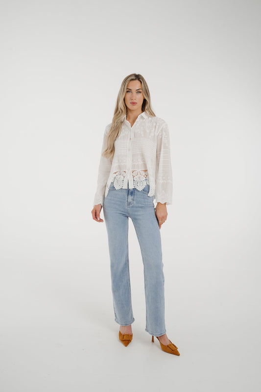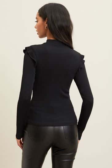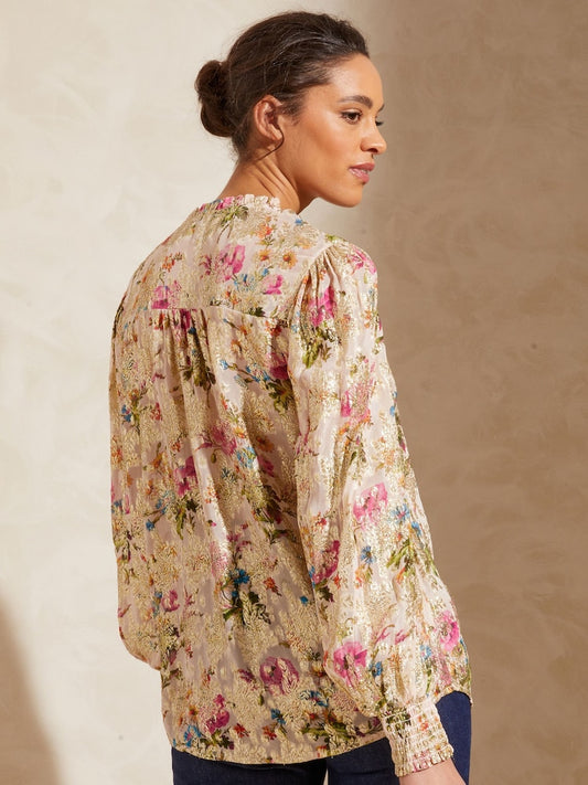 Metallic Floral Frill Neck V Neck Long Sleeve