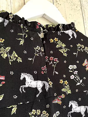 Multi Floral Bird Horse Print High Neck Ruffle Tunic Top