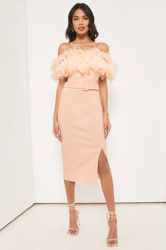 Premium Feather Belted Bardot Dress