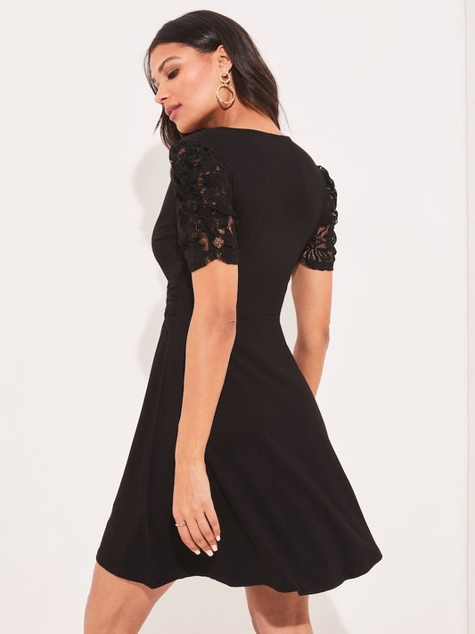 Black Lace Petite Jersey Knot Front Mini Skater Dress