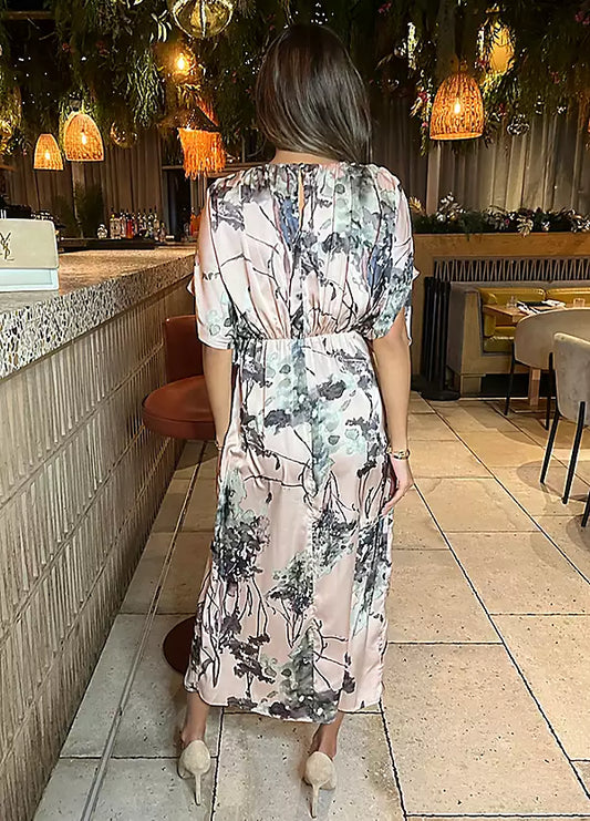 Dusty Pink Printed Batwing Top Wrap Skirt Midi Dress
