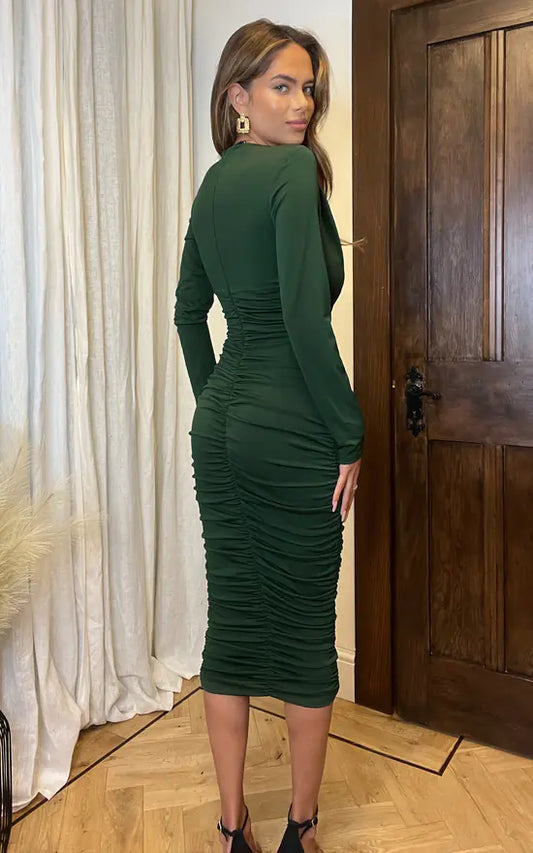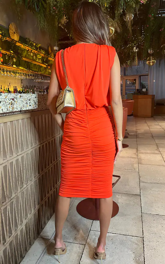 Burnt Orange Ruched Skirt Bodycon Midi Dress