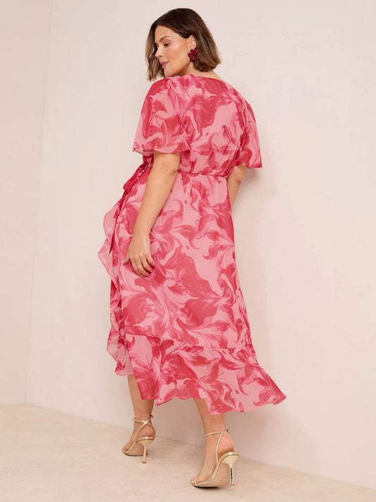 Friends Like These Pink Floral Curve Chiffon Mix Flutter Sleeve Wrap Dress