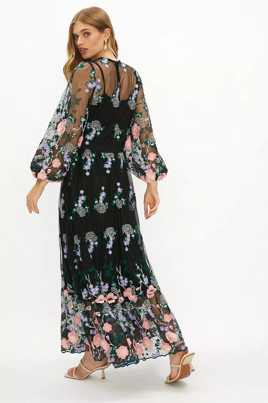 Embroidered Mesh Midaxi Dress Black