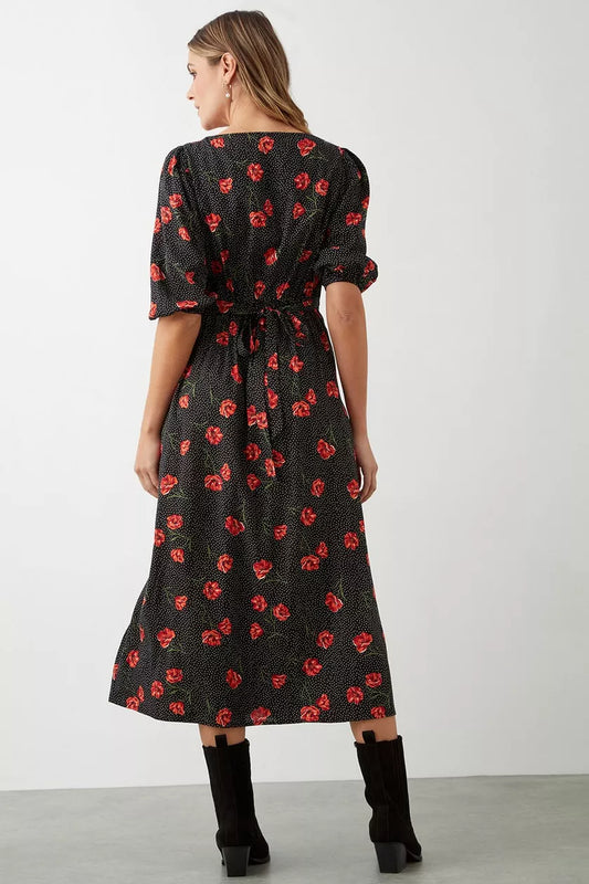 Black Spot Floral Button Through Midi Dress