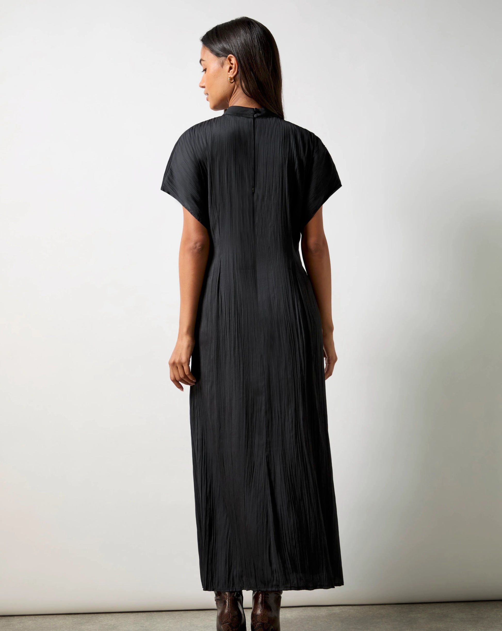 Our Black High Neck Plisse Dress is a fully lined, midi-length dress in a crinkle plisse texture. It features a high neck band, grown-on sleeves, and a back zip, with a relaxed column silhouette. Versatile for dressing up or down, this dress offers both style and comfort.