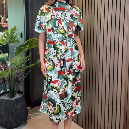 Green Abstract Print High Neck Wrap Skirt Midi Dress