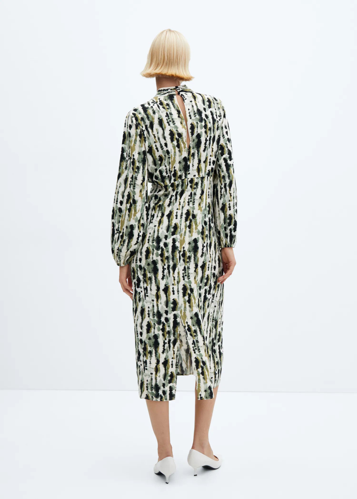 Fluid fabric. Animal print. Long design. Straight Design. Crossed V-neck. Long sleeves with elastic cuffs. Button fastening on the back section. Invisible back zip fastening. Gathered detail. Party and Ceremony Collection. Printed Design.