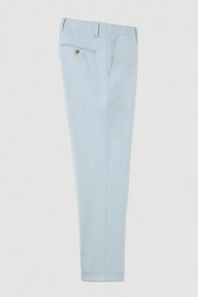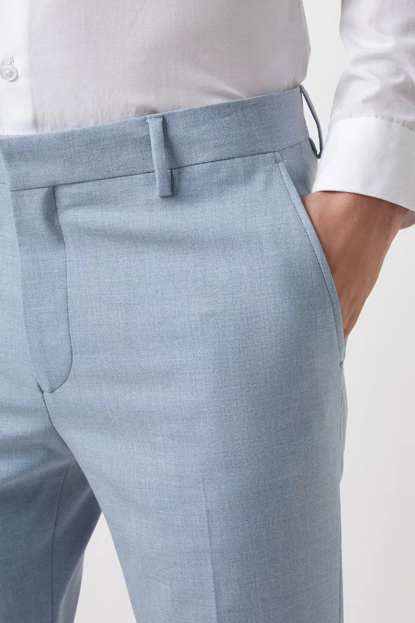 Style: Skinny Fit Pale Blue End On End Suit Trousers. Ideal for: Smart. Fit: Skinny. Design: Single Button. Model wears size UK 10 and is 5' 9" tall.