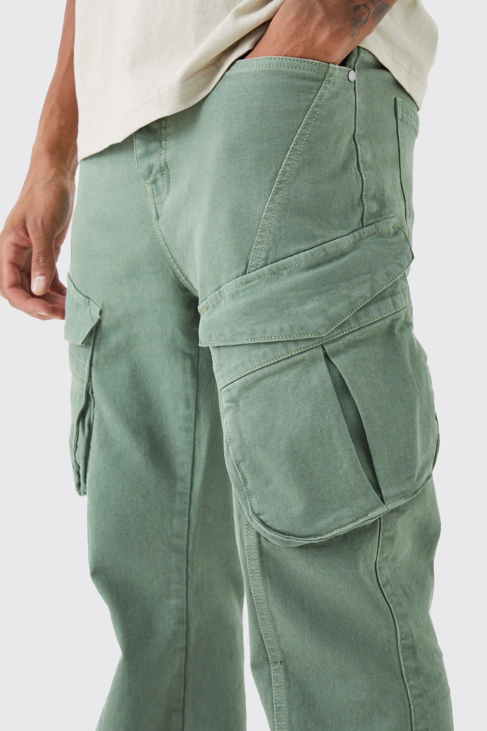 Tall Relaxed Flare Rigid Washed Ripped Cargo Jean Sage