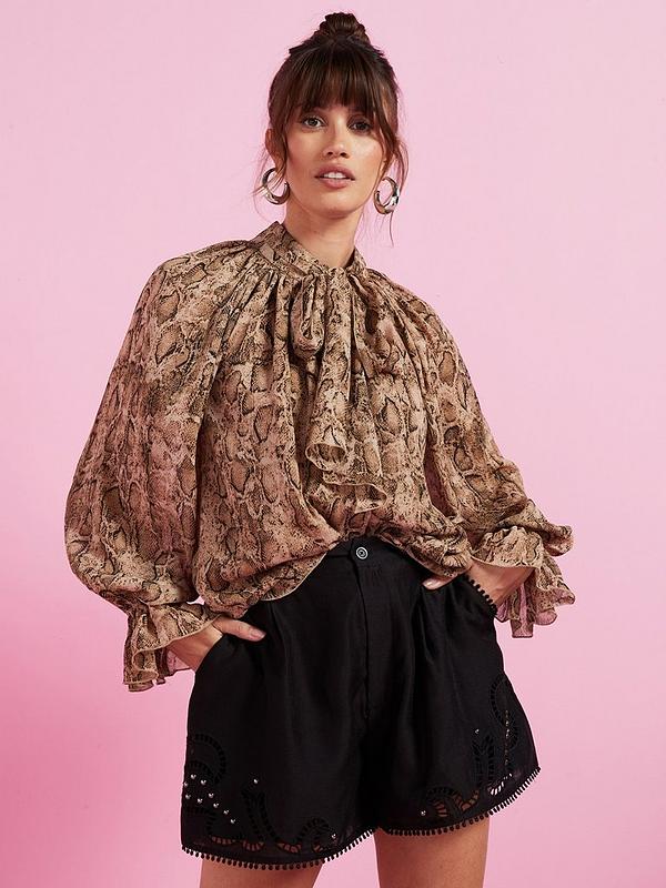 V by Very Snake Printed Volume Sleeve Sheer Blouse - Brown