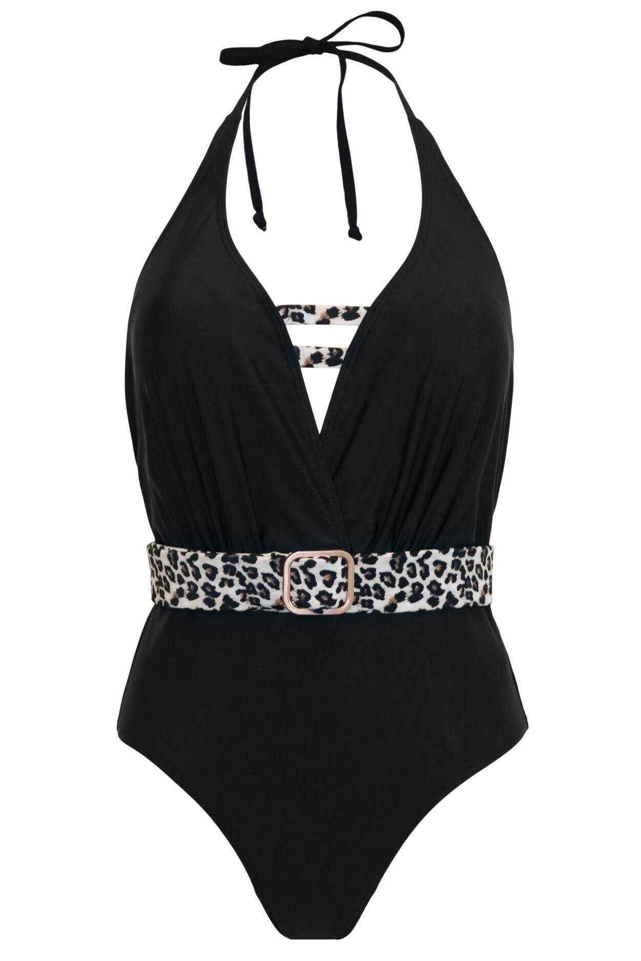 Wild Halter Belted Plunge Control Swimsuit - Black/Leopard