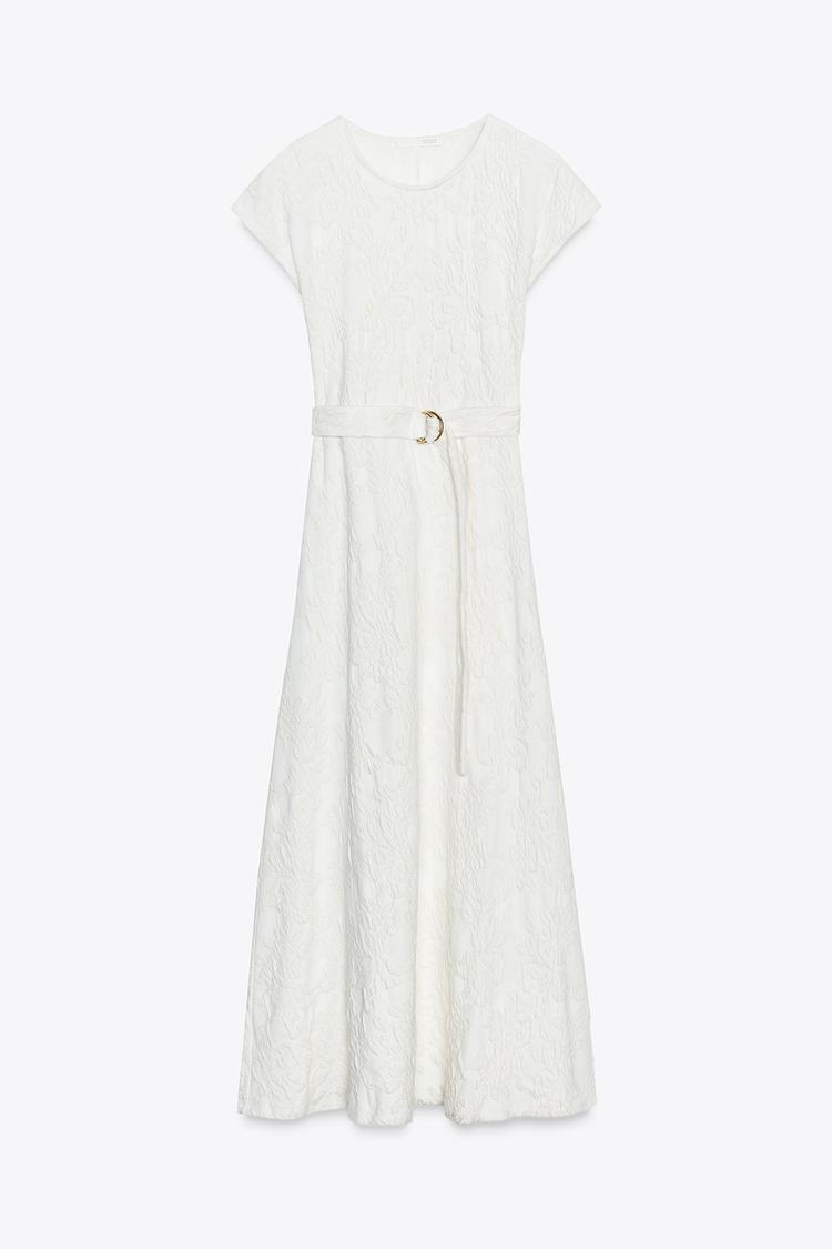 - Style and Length: It is a midi-length dress with an A-line cut hem.